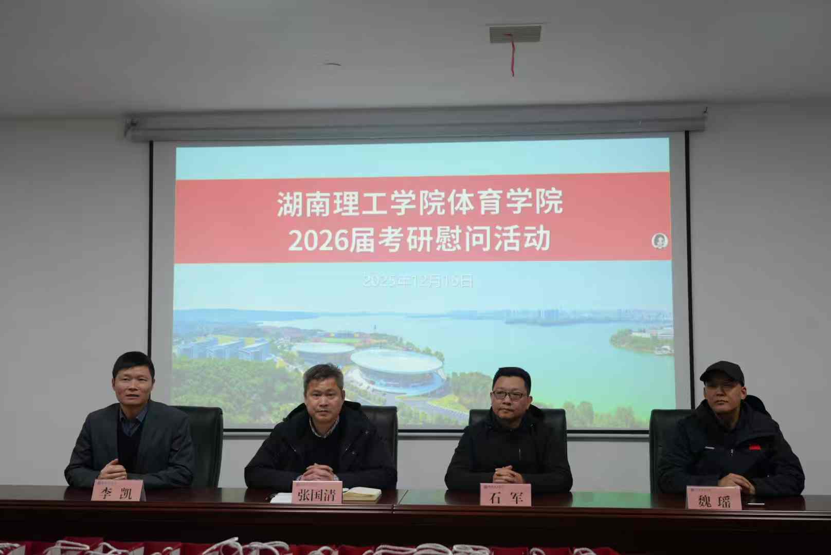 为鼓舞考研学子士气,助力学子冲刺备考,2025年12月18日,湖南理工学院体育学院于20205会议室开展了2026届考研慰问活动。学院党委书记石军、院长(主持工作)张国清、副书记李凯、副院长魏瑶出席活动,与考研学子面对面交流。