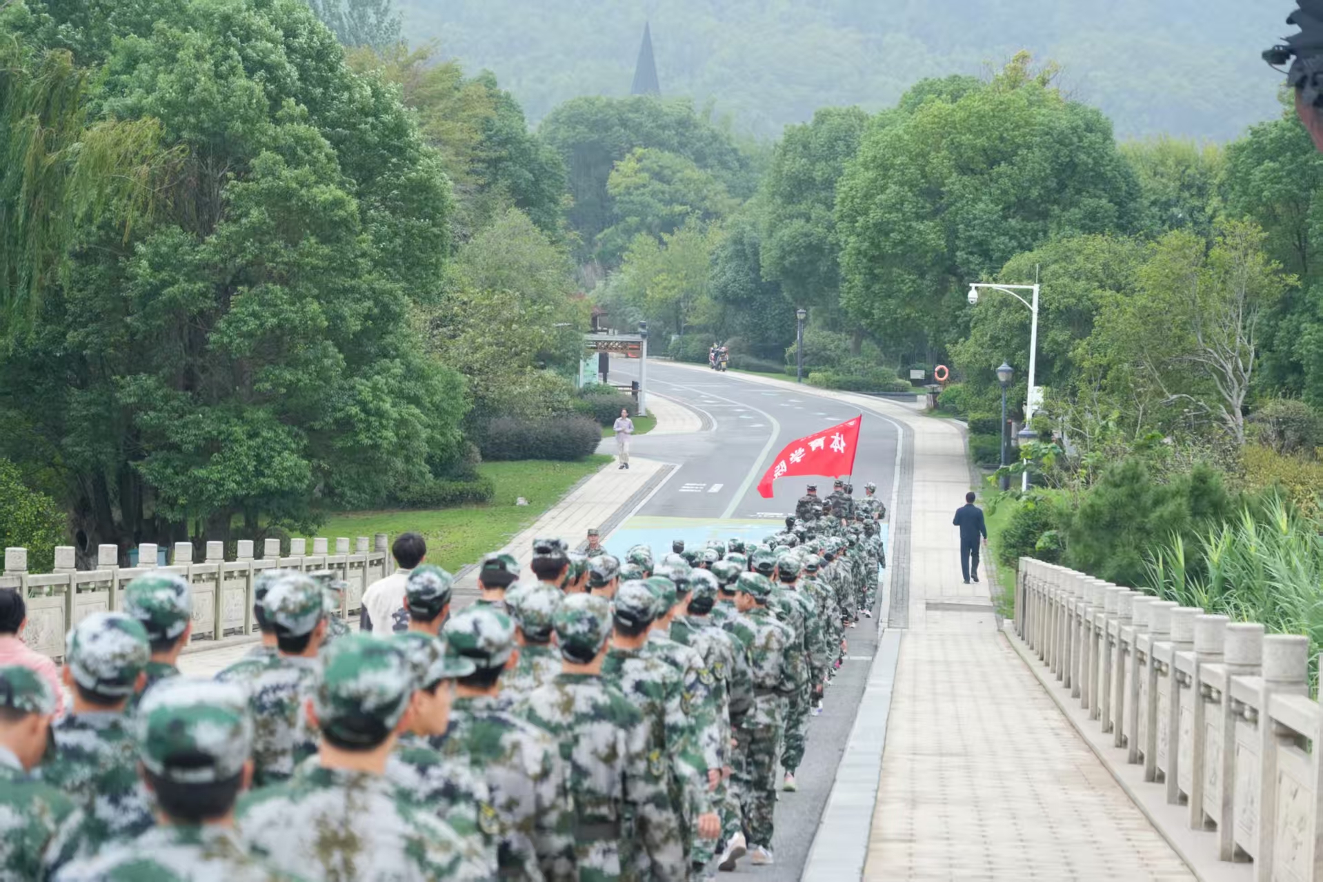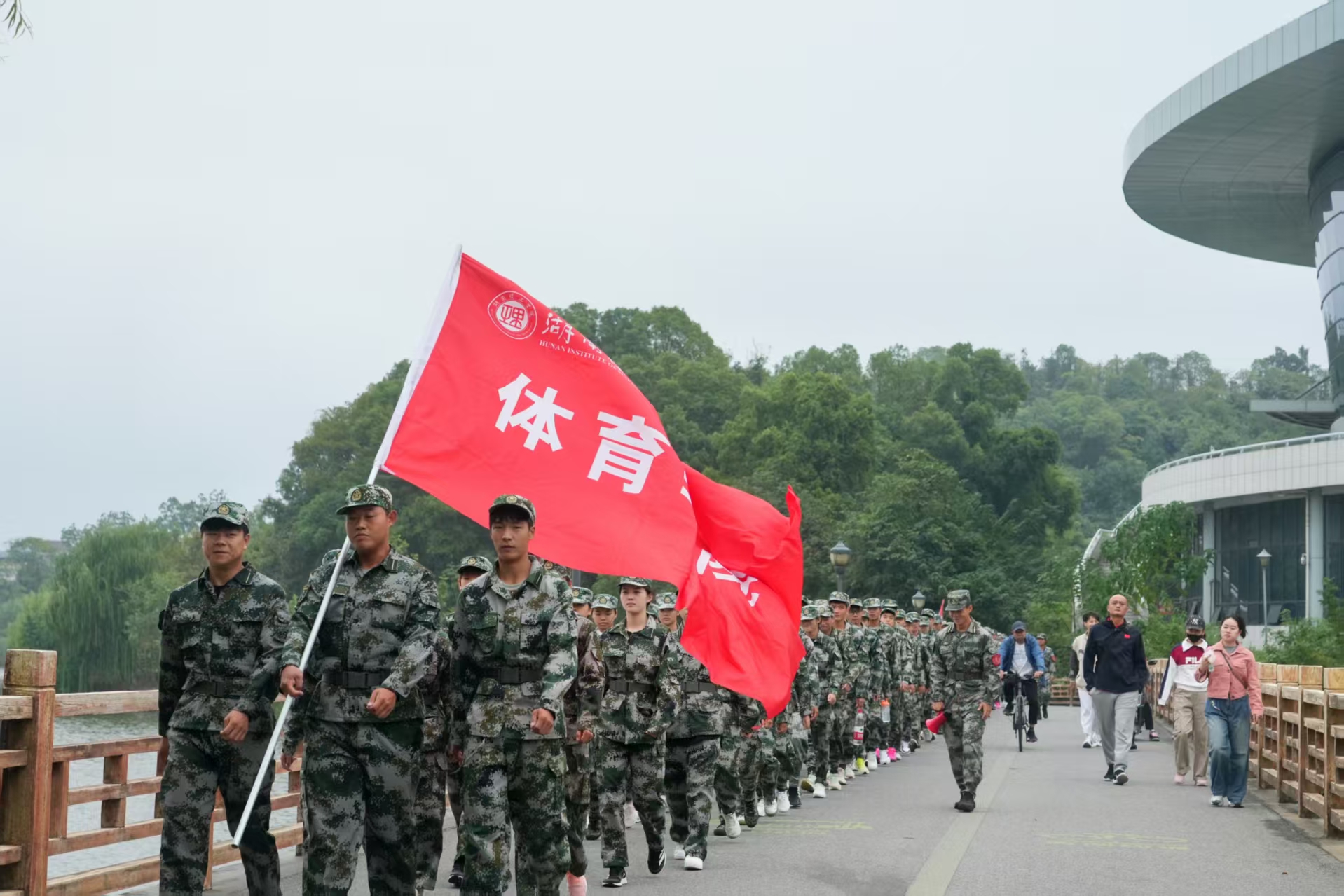9月23日清晨,体育学院2025级新生开启15公里军训拉练,党委副书记李凯、辅导员宾思捷及各班班主任全程陪同。