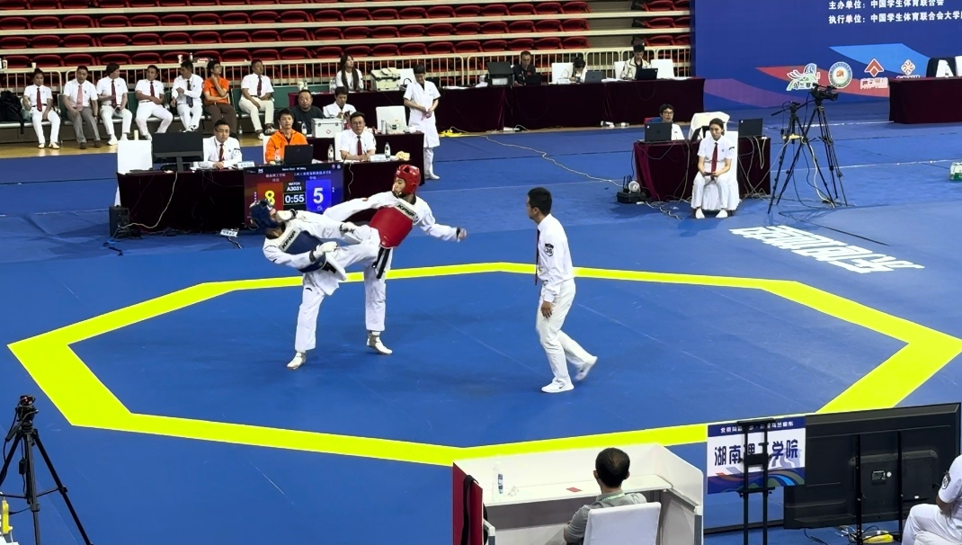 2025年7月12日在近日圆满落幕的第19届中国大学生跆拳道锦标赛总决赛中,湖南理工学院跆拳道队主力队员周瑶同学表现亮眼,从预赛一路过关斩将闯入半决赛,在激烈的角逐中虽因临场失误遗憾落败,但最终凭借出色的综合表现荣获体育专业组男子项目第三名,为学校赢得了荣誉。